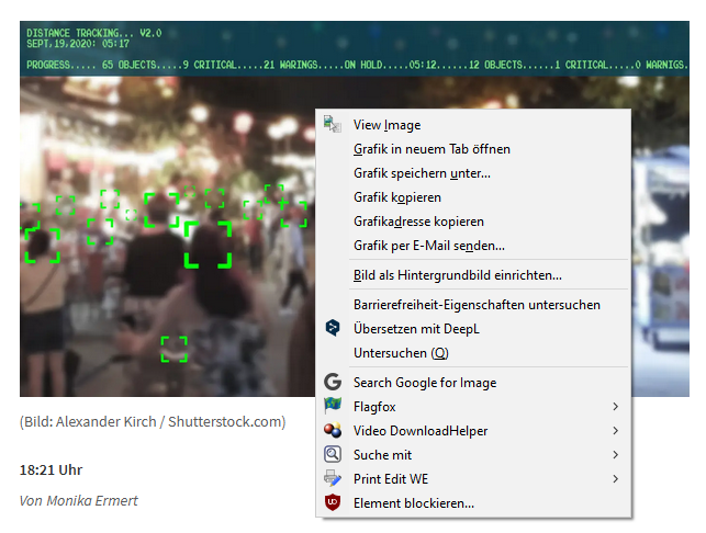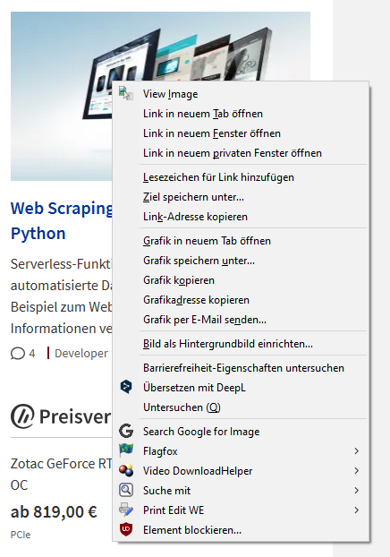 Alles anzeigen(function() { if (!window.gBrowser) return; function viewMedia(event) { let where = whereToOpenLink(event, false, false); let referrerInfo = gContextMenu.contentData.referrerInfo; let systemPrincipal = Services.scriptSecurityManager.getSystemPrincipal(); if (gContextMenu.onCanvas) { gContextMenu._canvasToBlobURL(gContextMenu.targetIdentifier).then(function(blobURL) { openUILinkIn(blobURL, where, { referrerInfo, triggeringPrincipal: systemPrincipal, }); }, Cu.reportError); } else { urlSecurityCheck( gContextMenu.mediaURL, gContextMenu.principal, Ci.nsIScriptSecurityManager.DISALLOW_SCRIPT ); openUILinkIn(gContextMenu.mediaURL, where, { referrerInfo, forceAllowDataURI: true, triggeringPrincipal: gContextMenu.principal, csp: gContextMenu.csp, }); } } let item = document.getElementById('context-viewimage'); item.setAttribute('oncommand', '(' + viewMedia.toString() + ')(event);'); item.label = 'Grafik anzeigen'; })(); -