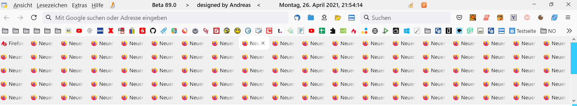 Nach dem Update eben auf FF88 ist nun meine Tableiste wieder ganz nach oben verschoben und ich hab beim öffnen eines neues TABs merkwürdige Lücken zwischen den TABs und diese werden immer größer.