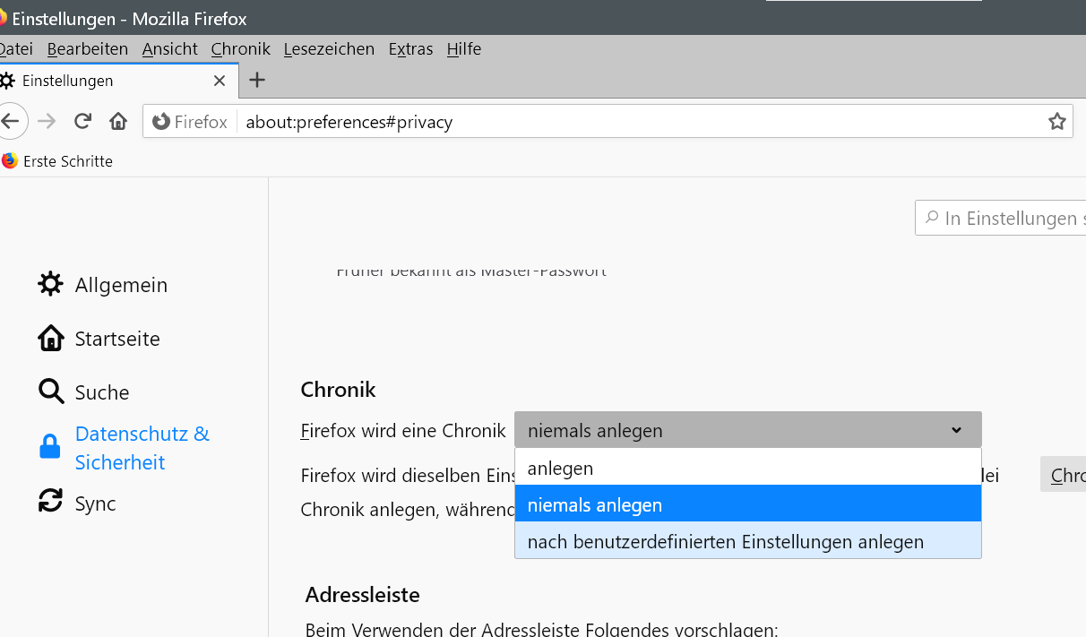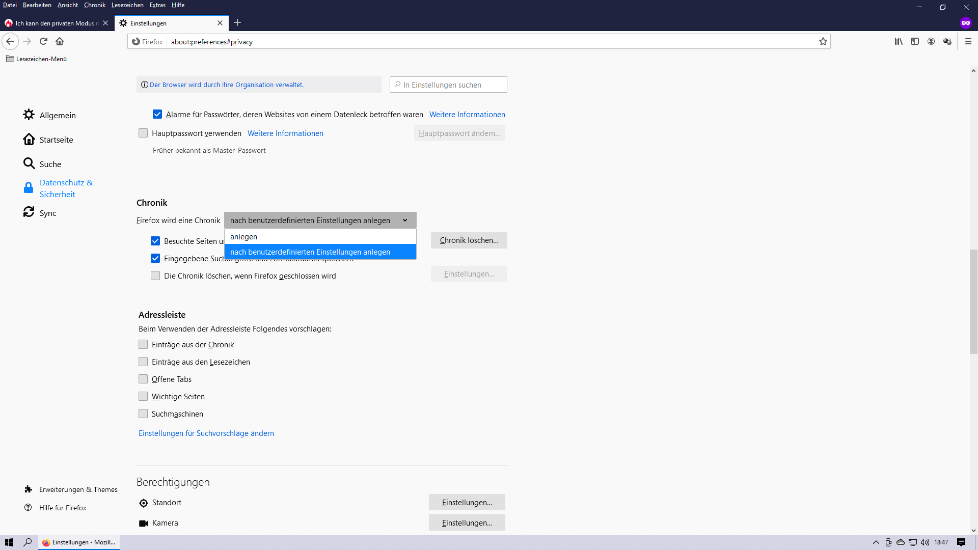 Es gibt bei mir weder den Menüpunkt "Neues Fenster im Privaten Modus) noch gibt es unter Chronik einen Haken bei "immer im Privaten Modus" den man entfernen könnte.