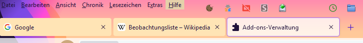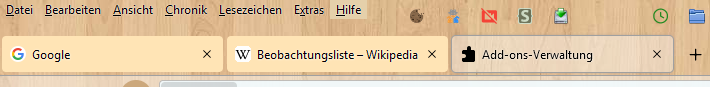 Das gelingt mir jedoch nicht beim ausgewählten (selected) tab (hier: Add-ons-Verwaltung), da dieser je nach gewähltem Theme immer wieder anders aussieht. Gibt es da eine Möglichkeit, diesen farblich anzupassen und die Änderung bei jedem Theme beizubehalten?