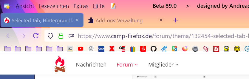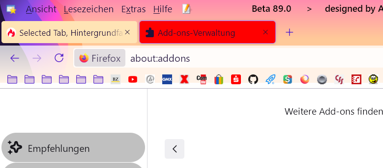 Das gelingt mir jedoch nicht beim ausgewählten (selected) tab (hier: Add-ons-Verwaltung), da dieser je nach gewähltem Theme immer wieder anders aussieht. Gibt es da eine Möglichkeit, diesen farblich anzupassen und die Änderung bei jedem Theme beizubehalten?