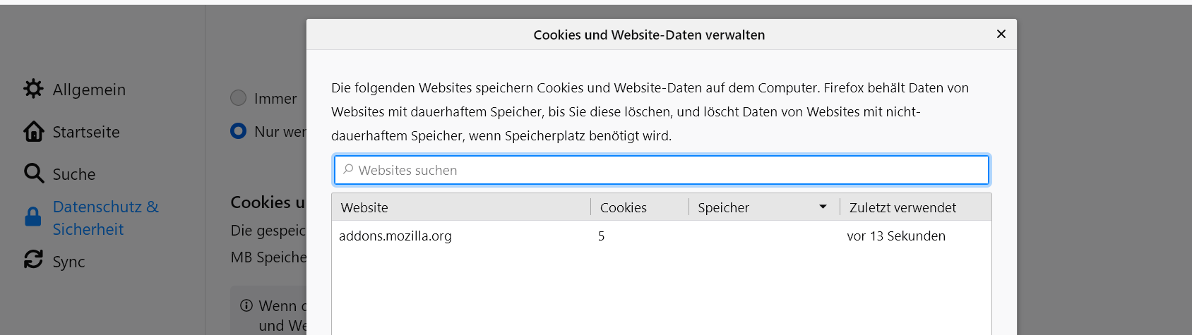 Gespeicherte Cookies usw. werden nicht angezeigt und sind nicht zu löschen