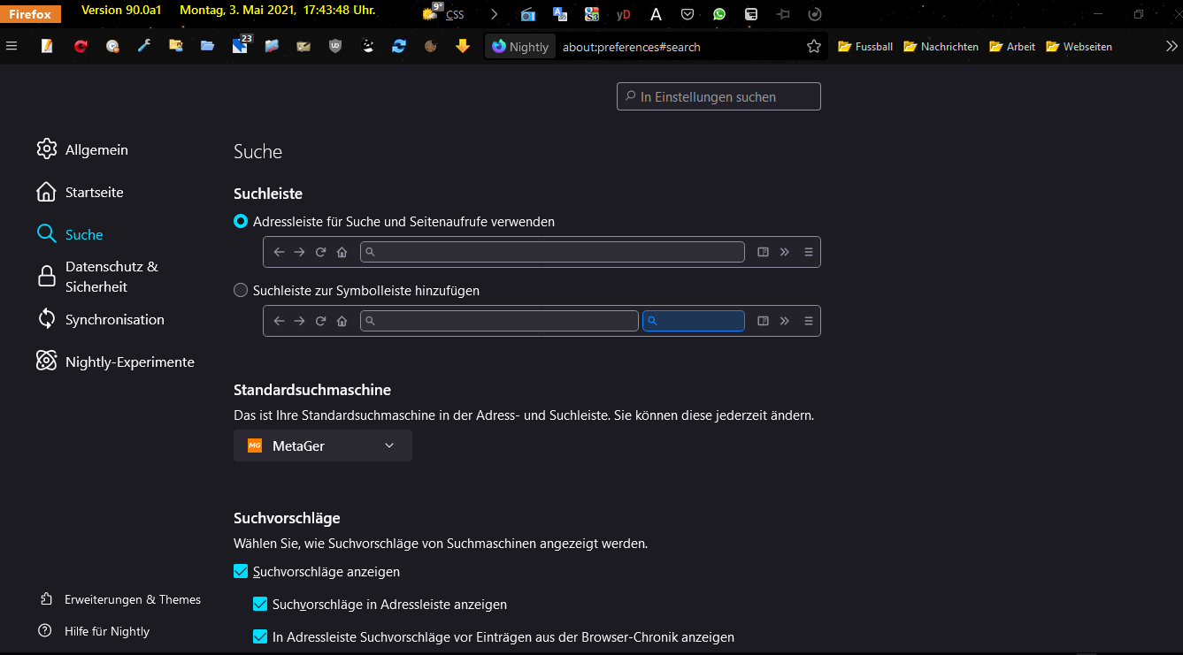 3. Mai 2021 um 17:51 #1 Firefox-Version Nightly 90 Betriebssystem win 10 Seit gestern ist mir aufgefallen das die Nightly mit Google startet,ist das so beabsichtigt?Meine Einstellung sagt etwas anderes.