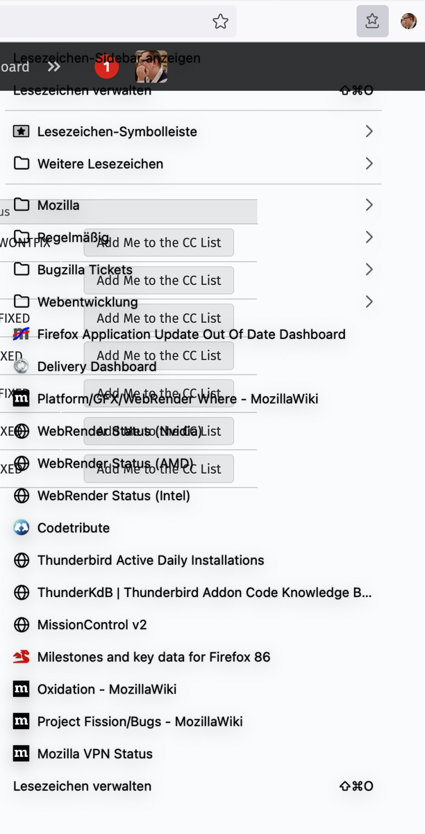 • Sich damit temporär zu behelfen, bedeutet aber auch, nach jedem Nightly-Update zu prüfen, ob die Nachfolge-Fixes bereits gelandet sind und wie sich diese auswirken. Sowas wird schnell vergessen und hat dann möglicherweise Langzeitfolgen. Deswegen rate ich davon ab. Wer eine Nightly-Version nutzt, sollte auch für ein, zwei Tage mit temporären Fehlern leben können. Zumal das Lesezeichen-Menü in Folge dieser Änderung sogar schon schlimmere Fehler hatte (mittlerweile behoben), siehe Anhang. ;)