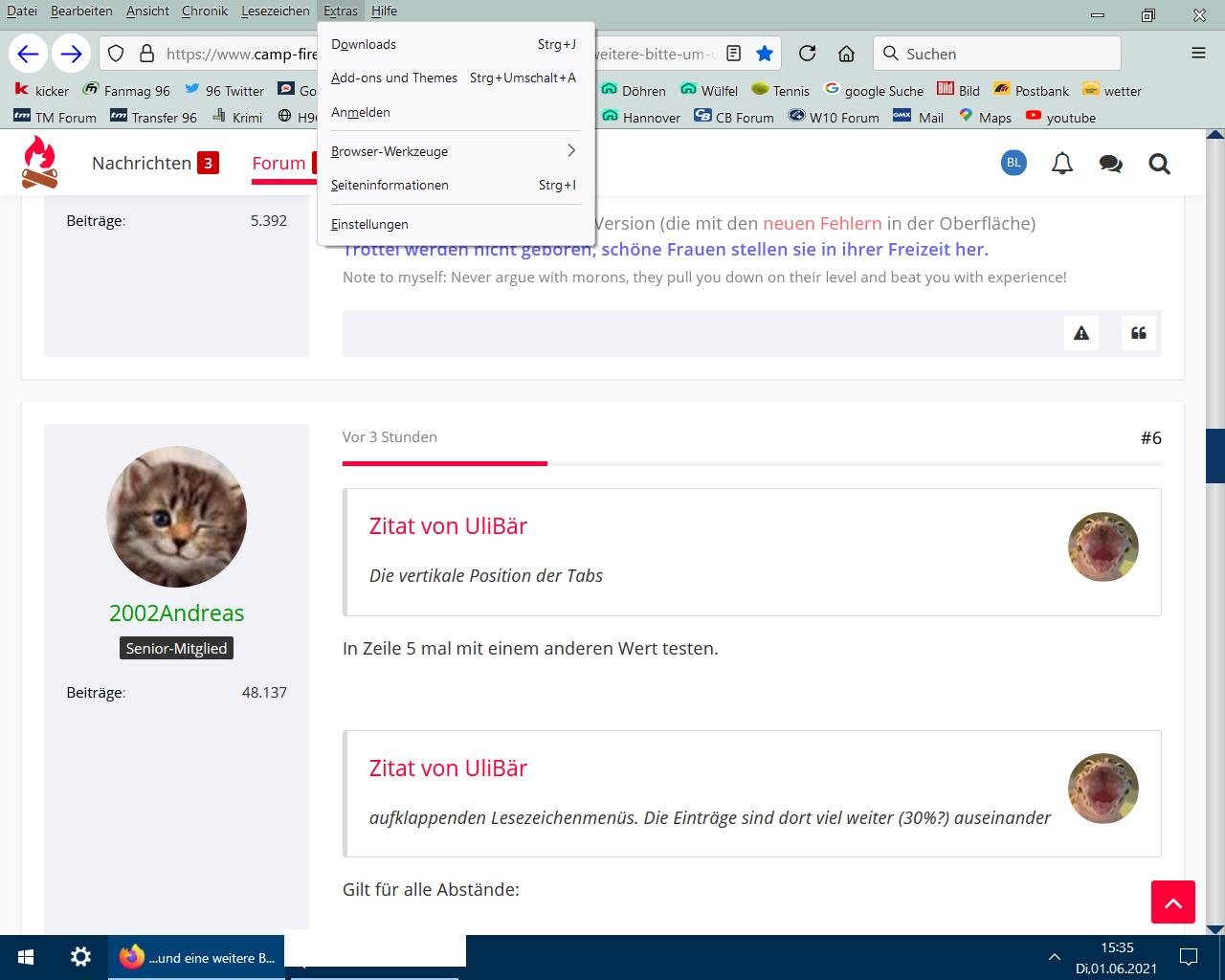 ich lese mit großem Interesse die Lösungen. Ich habe nun das selbe Problem mit der 89, die Einträge der Drop-Downs in der Menüleiste haben einen zu großen Abstand. Eine Bitte: Kann mir die Lösung mal jemand für den 3. Bildungsweg erklären? Was ist denn "mein CSS"? Ich kann about:config aufrufen und nach Einträgen suchen, mehr aber nicht.