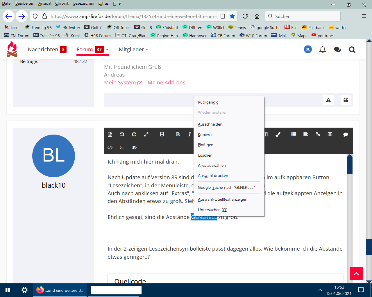 Nach Update auf Version 89 sind die Abstände der Lesezeichen im aufklappbaren Button "Lesezeichen", in der Menüleiste, doch etwas groß. Siehe Photo