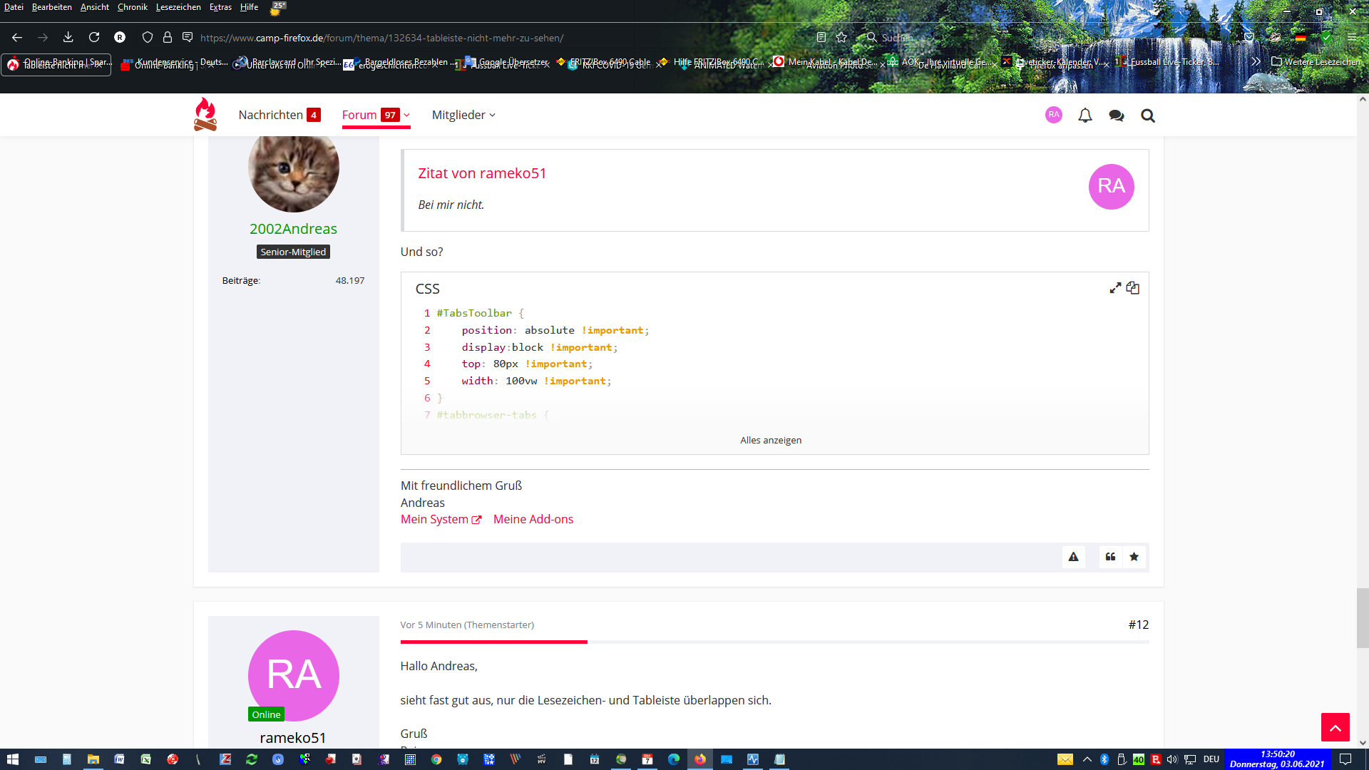 alles richtig, was du schreibst. Aber nach dem Update war diese Einstellung nicht mehr vorhanden (userchrome) und nach Wiederherstellung dieser Einstellungen ist die Tableiste immer noch weg bzw. sehe ich diese beim Klick auf Symbolleisten anpassen am untersten Rand des Bildschirmes und auch nur solange bis ich einen dortigen Tab geöffnet habe. Anschließend muß ich wieder auf Symbolleisten anpassen klicken, um diese wieder zu sehen. Und das kann doch nicht im Sinne des Erfinders sein.