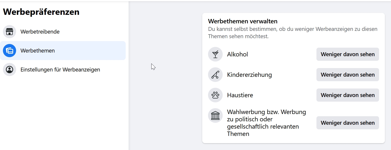 Zitronella Es geht nicht um die Facebook Werbung, sondern um die Werbung in den Videos. Dazu gibt es keine Einstellung bei Facebook. Das habe ich alles schon durchsucht,