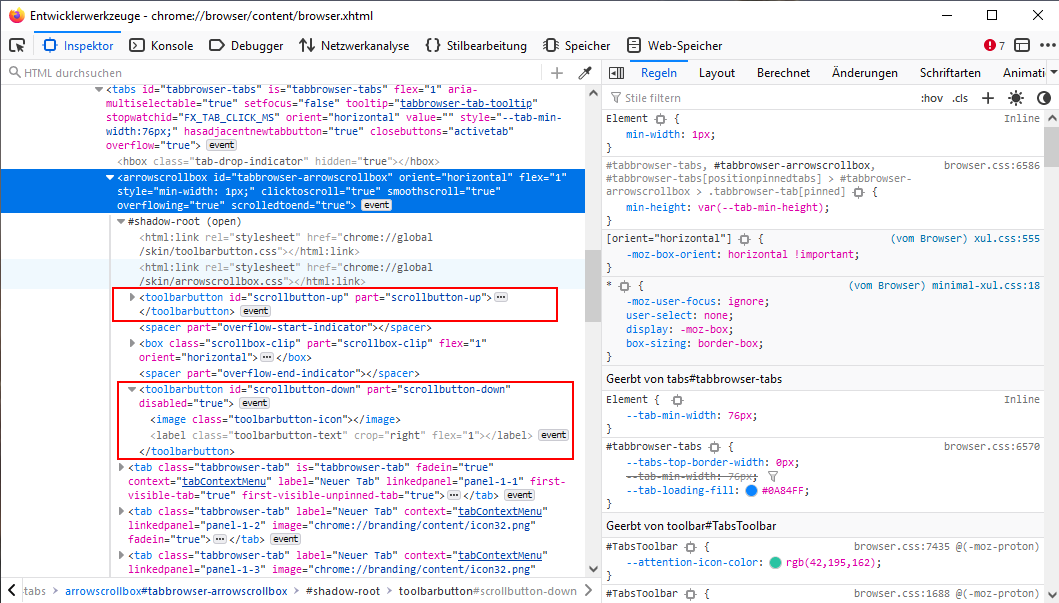 Ursache ist eine maximale Höhe voin 32px für die Tabs, das klappt auch, werden die Scrollbuttons sichtbar, bleibt das auch, aber die Scrollbuttons sind 37px hoch. Folgendes CSS greift nicht (der untere teil)