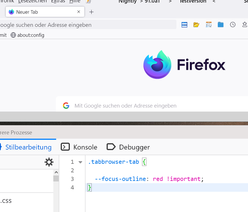 • Ich habe für .tabbrowser-tab --focus-outline auf none gesetzt und schon habe ich das Problem nicht mehr.