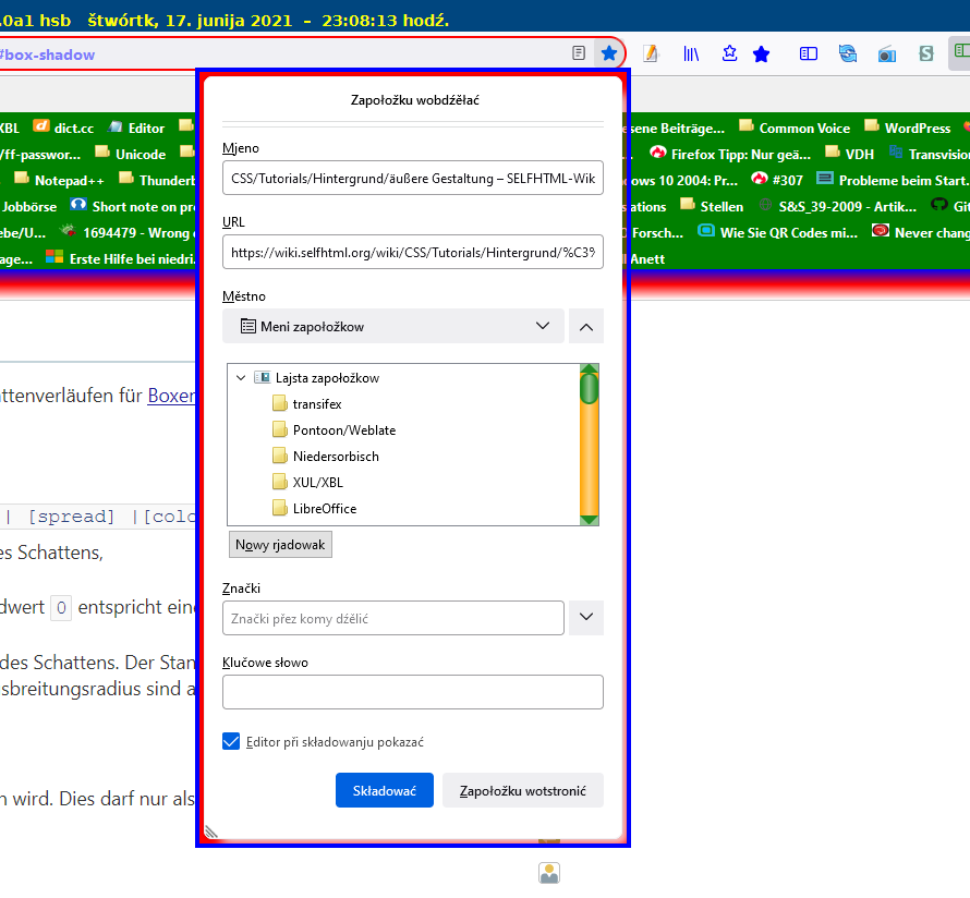 Mal hier noch etwas dazu. Da das Lesezeichen-hinzufügen/bearbeiten-Fenster ein Popup-Fenster ist, musst du da noch eine besondere Einstellung treffen. Du musst in den Browserwerkzeugen noch die Einstellung Popups nicht automatisch ausblenden aktivieren, sonst gehen Popups immer zu, bevor du überhaupt einen Eintrag auswählen kannst.
