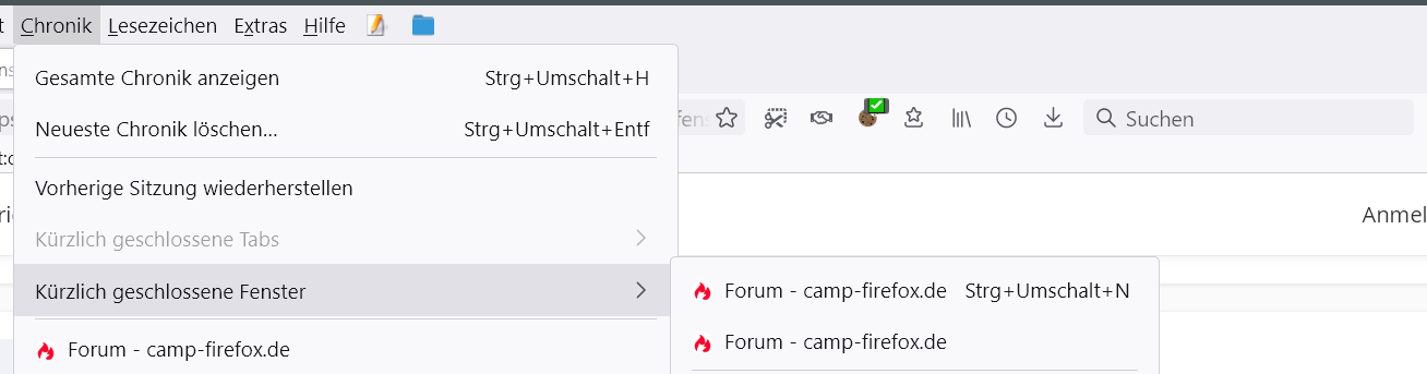 Vierter Versuch (was da aktiv war, ist mir entgangen): hat ein Fenster mit nur einem Tab geöffnet, dessen Inhalt nichts mit den im geschlossenen Fenster enthaltenen zu tun hat und von mir irgendwann vor einer Woche aufgerufen worden war, also lange vor dem, was ich suche.