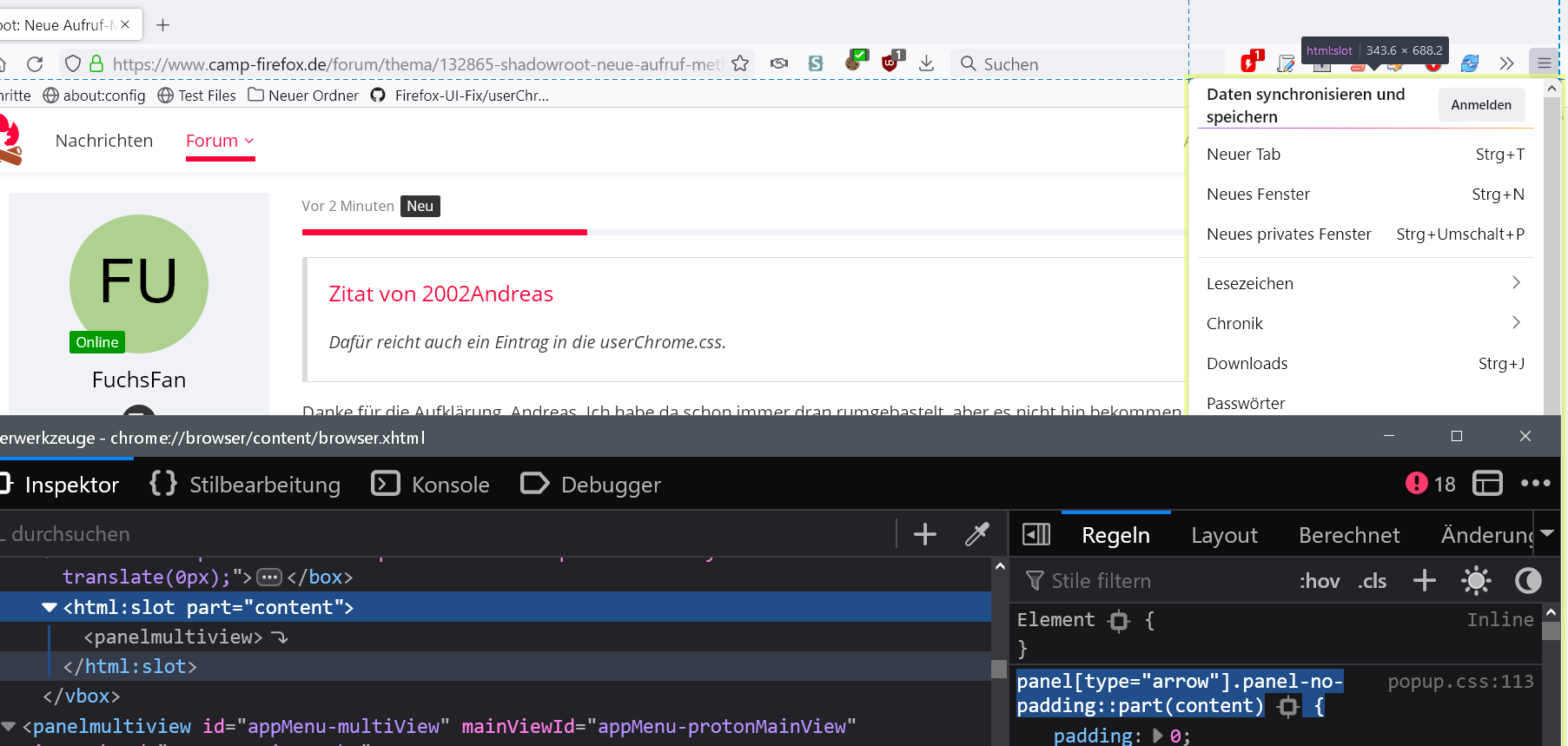 Bei diesen Elementen handelt es sich um sogenannte 'ShadowRoot'-Objekte, die getrennt von dem übrigen Objekt-Baum existieren und in sich geschlossen sind. 'ShadowRoot'-Objekte werden an immer mehr Stellen im Firefox-Code für die Benutzerschnittstelle eingesetzt und es wird immer schwieriger dafür Anpassungen vorzunehmen, da über die klassische 'userChrome.css' kein direkter Zugriff auf Teile dieser 'ShadowRoot'-Objekte möglich ist.