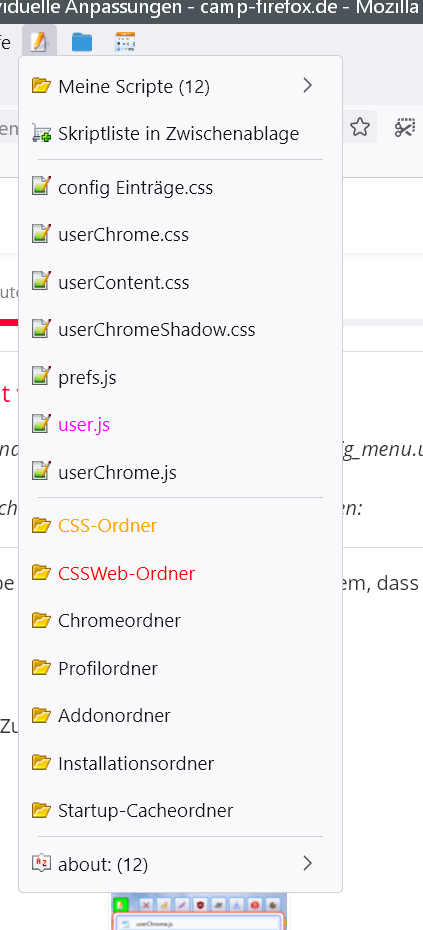 - Datei userChrome.js (befindet sich in der entp. zip-Datei im Ordner 'chrome') wird in das 'chrome' Verzeichnis des Profil-Ordners kopiert (an die Stelle, wo sich auch die 'userChrome.css' befindet).