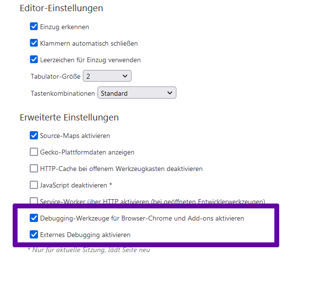 21. Juni 2021 um 00:10 #2 user_pref("devtools.chrome.enabled", true);user_pref("devtools.debugger.remote-enabled", true);Und um sich beim Öffnen der Browser-Werkzeuge die Abfrage zu ersparen:user_pref("devtools.debugger.prompt-connection", false);