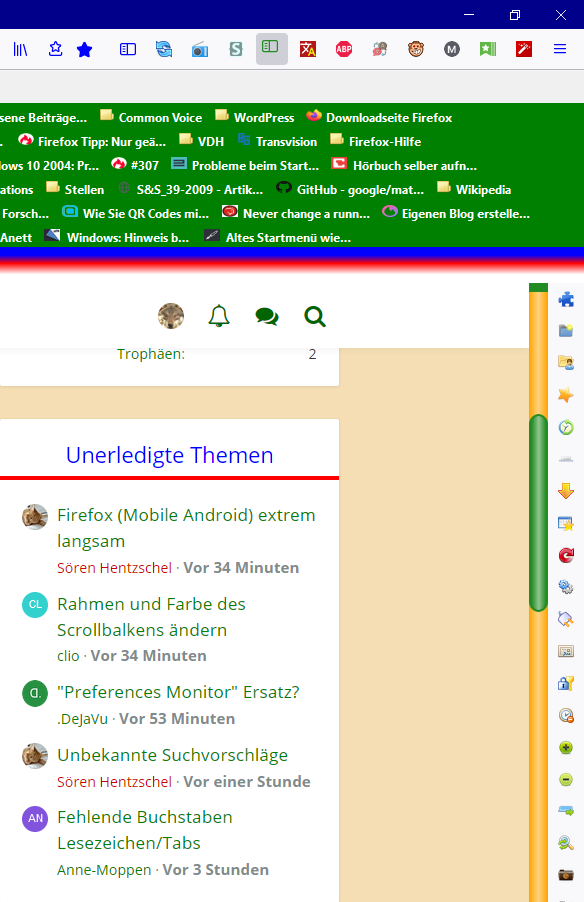 • Das mit den Themes verstehe ich überhaupt nicht. Ich hab jetzt mal wahllos ein paar Themes installiert und bei keinem davon hat sich am Scrollbar das geringste verändert. Es wurde immer nur das Aussehen der Tabs und der Leisten oben verändert.