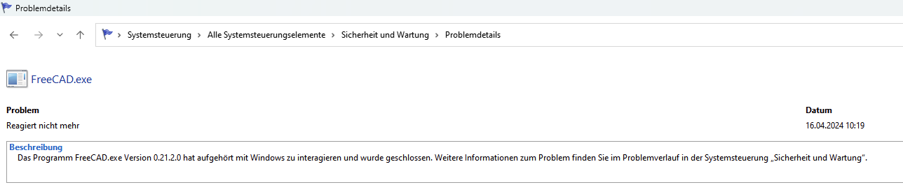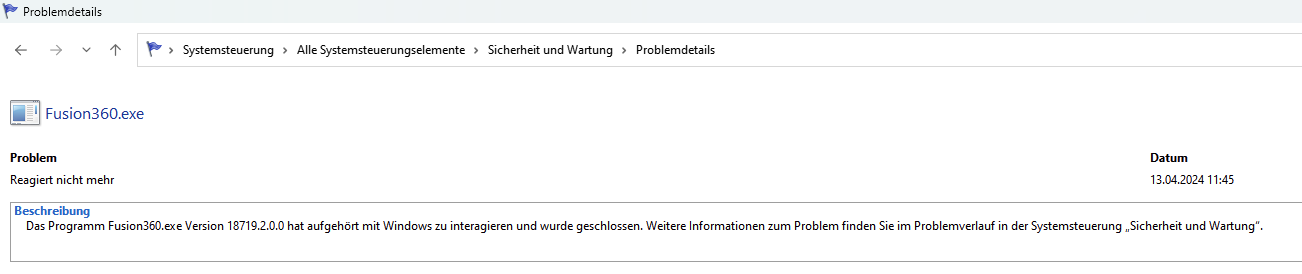 Das Programm Fusion360.exe Version 18719.2.0.0 hat aufgehört mit Windows zu interagieren und wurde geschlossen. Weitere Informationen zum Problem finden Sie im Problemverlauf in der Systemsteuerung „Sicherheit und Wartung“.