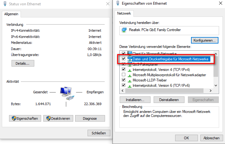 Die Reparatur bringt nichts, solche Fehler sind dann tiefer zu suchen, und zwar genau in diese Richtung. Datenfreigabe muss auch im Adapter (da wo auch IPv4/IPv6 stehen) erfolgen