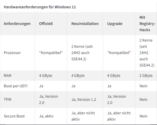 Nur, weil das ein Redakteur von heise schreibt, die ihrerseits nicht unbedingt nur für Fakten-basierten Journalismus bekannt sind, macht es das nicht zu etwas anderem als einer unbelegten Unterstellung. Tatsache ist, dass es technische Argumente dafür gibt, einen TPM-Chip oder einen bestimmten CPU-Befehlssatz vorauszusetzen, insbesondere wenn mal überlegt, wie alt CPU sein müssen, damit diese das nicht unterstützen. Selbst, wenn es Unterschiede in den Voraussetzungen gibt, je nachdem, ob man eine Neuinstallation oder ein Update durchführt, ist das kein Beweis für „Willkür“, zumal die von dir per Screenshot gezeigte Tabelle deiner Argumentation sogar eher widerspricht. Denn die Tabelle zeigt höhere Anforderungen für das Upgrade als für eine Neuinstallation, Stichwort TPM. Die Prozessor-Angabe ist hier weniger relevant, denn nochmal: Die CPU muss mindestens (!) 16 Jahre (!) alt sein, damit das Fehlen von SSE 4.2 ein Argument sein kann. Bei so alter Hardware geht es wohl selten (praktisch „nie“) um eine Neuinstallation.