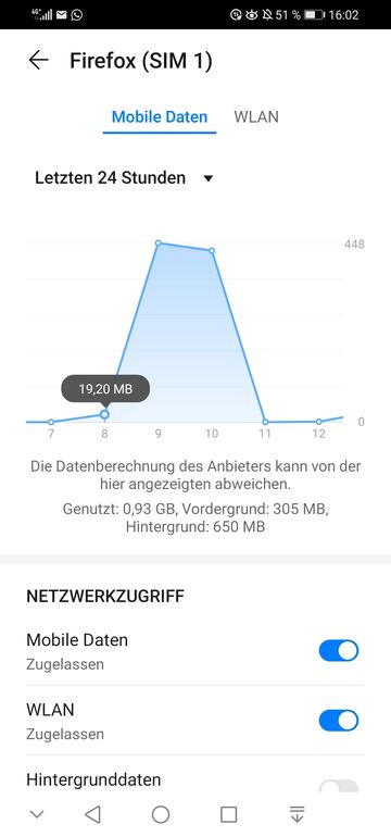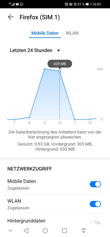 Ich habe gerade festgestellt, dass FF innerhalb von 4 Stunden, in denen er im mobilen Datennetz war, an 690MB Hintergrunddaten verbraucht hat. Wie kann das sein, 6 offenen Tabs mit Seiten, die datentechnisch eher nicht groß aufgezogen sind? Bin ich da zu "naiv"?