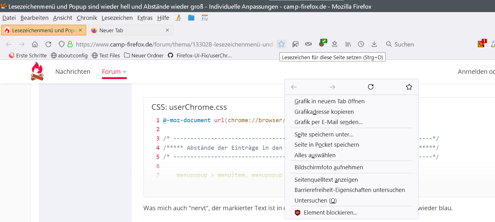 • Du hast dich dafür entschieden, CSS für Firefox (userChrome) zu nutzen. Entweder konsequent mit Änderungen leben oder sein lassen. Und falls, sich am besten auf das beschränken, was man auch allein hinbekommt - und CSS büffeln.