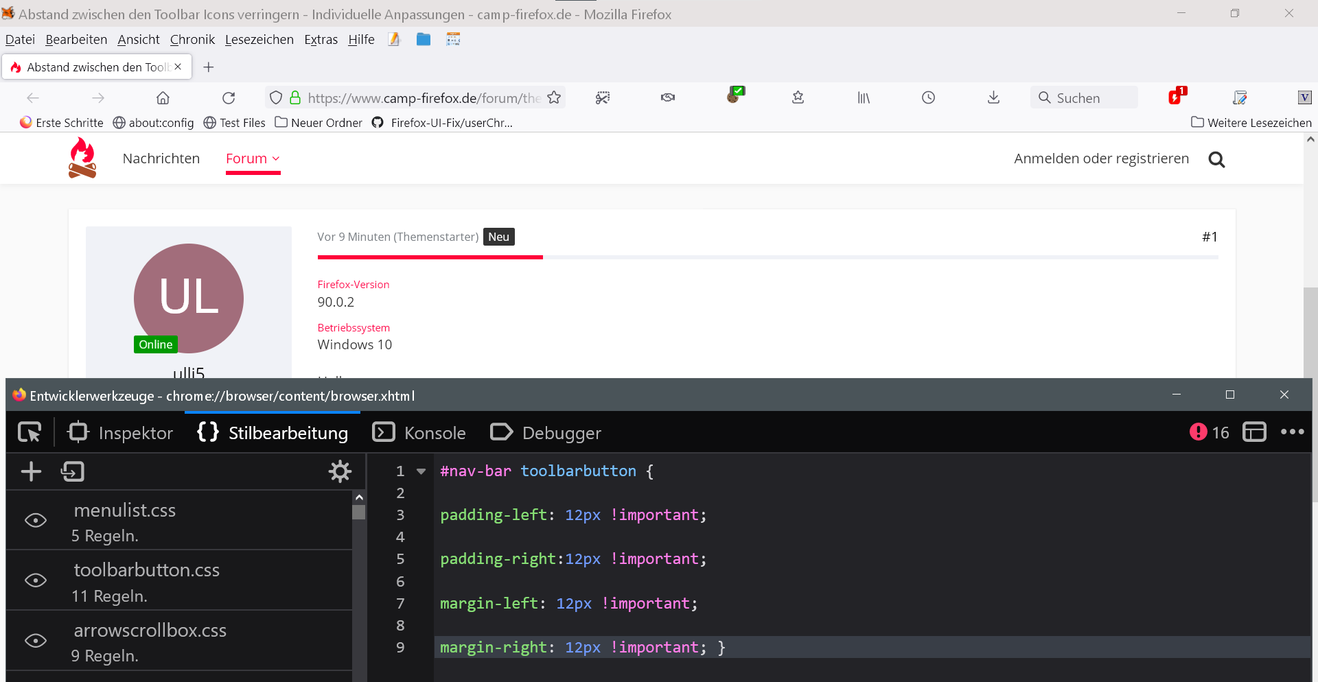 In der aktuellen Releaseversion 90.0.2 lässt sich der Abstand zwischen den Toolbar Icons nicht verringern. Folgender Code hat vorher funktioniert: