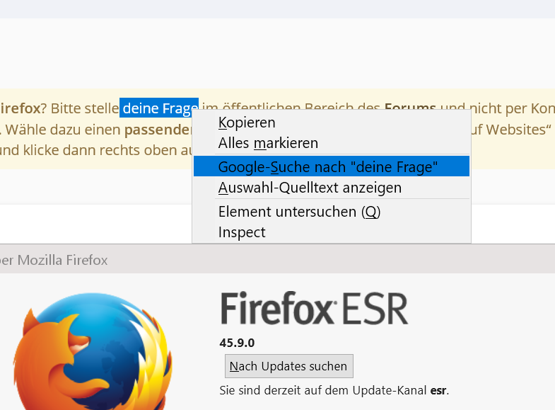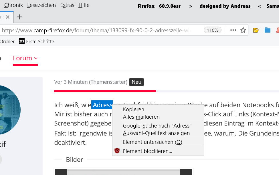Dieses neue Verhalten von Adresszeile u. Suchfeld bilde ich mir nicht ein. Auch habe ich immer die aktuellsten FF-Versionen upgedatet (meist nicht sofort, sondern mit einigen Tagen Verzögerung, weil es manchmal Bugs in den Updates gibt, die nach einigen Tagen dann gefixt sind). Das mit dem Kontext-Eintrag - ich habe erwähnt, dass es den ggf. schon zuvor gegeben hat, ohne dass es mir aufgefallen wäre.