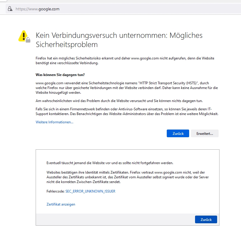 "Websites bestätigen ihre Identität mittels Zertifikaten. Firefox vertraut http://www.google.com nicht, weil der Aussteller des Zertifikats unbekannt ist [...]"