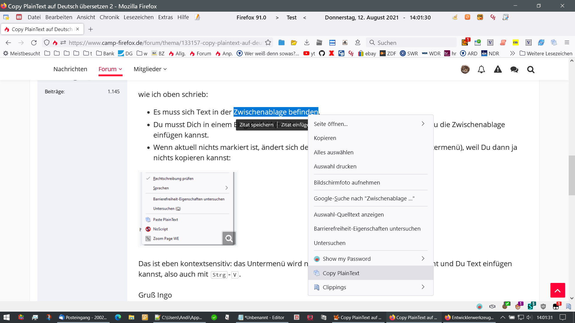 Zuerst einen Text Abschnitt in die Zwischenablage kopieren,