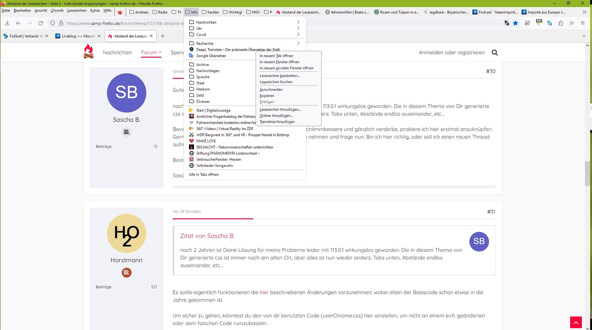nach 2 Jahren ist Deine Lösung für meine Probleme leider mit 113.0.1 wirkungslos geworden. Die in diesem Thema von Dir generierte css ist immer noch am alten Ort, aber alles ist nun wieder anders: Tabs unten, Abstände endlos auseinander, etc...