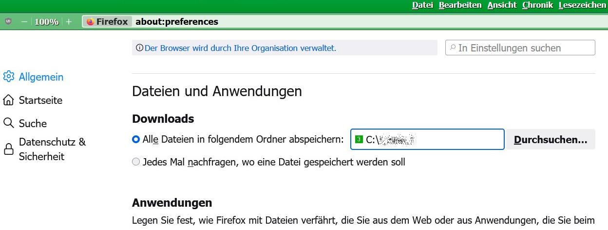 Nun klappt das nicht mehr, egal ob ich nun "Alle Dateien in folgendem Ordner abspeichern:" oder" Jedes Mal nachfragen, wo eine Datei gespeichert werden soll" auswähle, es wird immer der gleiche Ordner geöffnet.