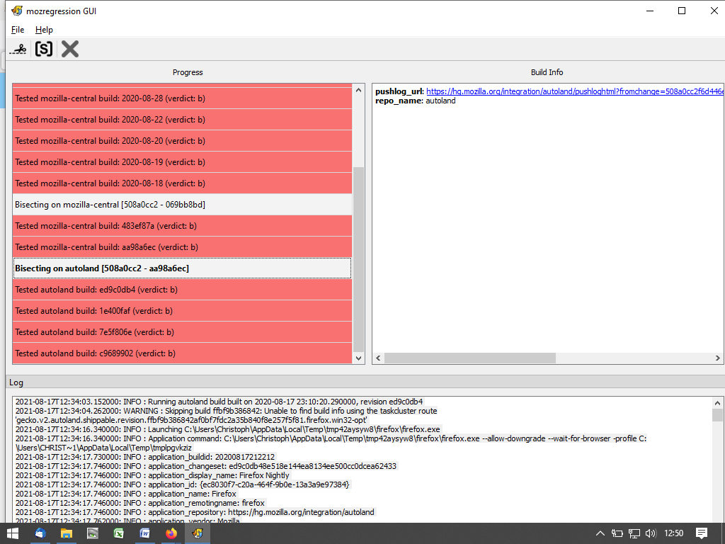 • < Rückfrage zu mozregression: Laut deinem Screenshot hast du immer ausgewählt, dass der Build fehlerhaft ist, ich erkenne da nicht ein einziges Mal, dass ein Build gut gewesen wäre.