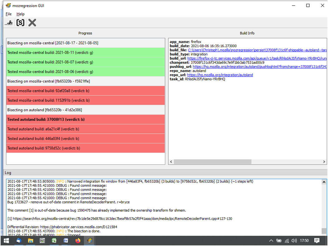 • Dann noch eine weitere Rückfrage zu mozregression: Laut deinem Screenshot hast du immer ausgewählt, dass der Build fehlerhaft ist, ich erkenne da nicht ein einziges Mal, dass ein Build gut gewesen wäre. Das kann theoretisch schon sein, aber möchtest du es vielleicht zur Sicherheit trotzdem noch einmal ausführen, mit einer etwas größeren Zeitspanne? Denn wenn nicht ein einziger Build dabei ist, der funktioniert, könnte das heißen, dass alle Builds in der gewählten Spanne fehlerhaft sind, womit man am Ende dann auch nicht auf die tatsächliche Ursache kommen würde, sondern einfach nur auf das letzte Ticket, welches durch die ständige Eingrenzung übrig bleibt.