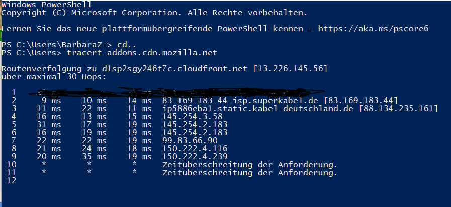 Externe, das wäre Hop 2, siehe auch milupo, ist von aussen dann gezielt angreifbar. Und intern geht niemanden was an, weil man so Rückschlüsse auf den Router (hier vermutlich die F-Box) nehmen könnte und aus dem Darknet bekannte Angriffe starten könnte (insofern es überhaupt Sicherheitslücken gibt). Auch wenn man meint, man wäre sicher, man muss es nicht wirklich provozieren, das betrifft vor allem die externe IP wie bei milupo, ob nun 24h-Trennung oder nicht.