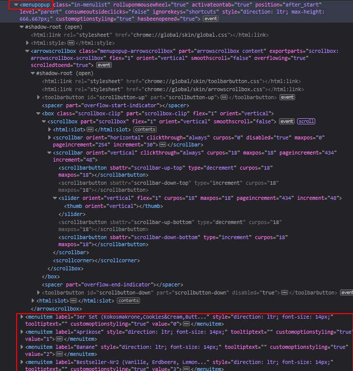 Da gibt es im Inspector (v91.0.1, keine Werkzeuge) nur ein select-Menü und option, aber kein menupopup