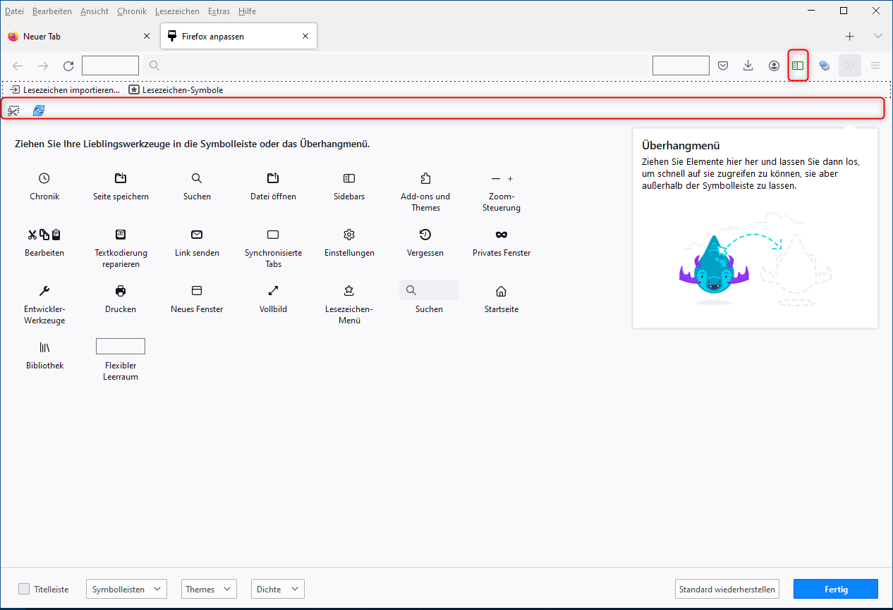 Gehe in das Anpassen-Fenster und dort ist jetzt eine leere Leiste über dem Text „Ziehen Sie Ihre Lieblingswerkzeuge in die Symbolleiste oder das Überhangmenü“. Zieh ein Symbol oder mehrere Symbole von darunter in diese Leiste hinein und klicke unten auf Fertig. Mit meiner Version ist jetzt die senkrechte Leiste am rechten Rand, da ja links die Seitenleiste ist.