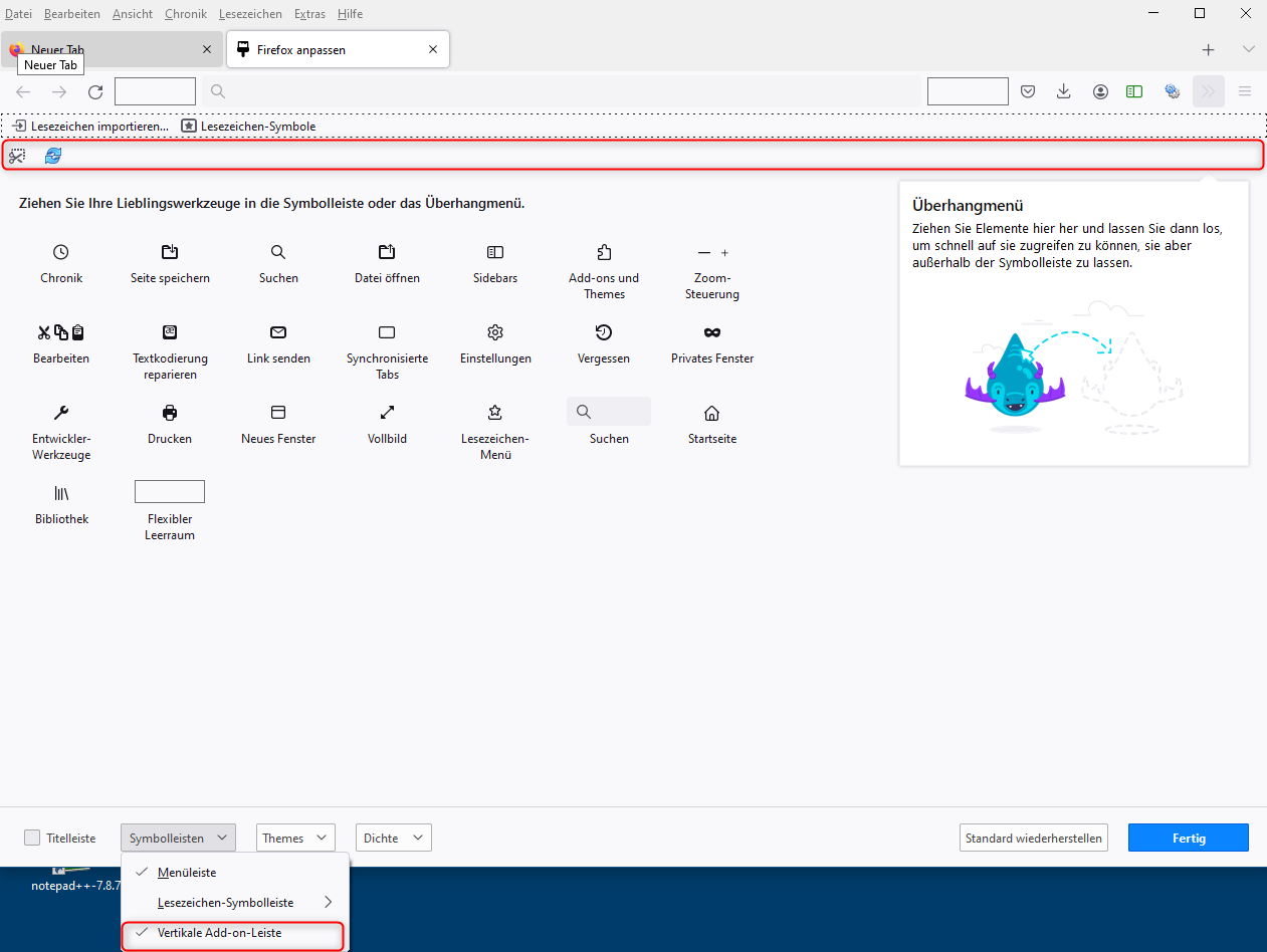 Die vertikale Add-on-Leiste ist auch im Anpassen-Fenster unten unter der Schaltfläche Symbolleisten eingetragen.