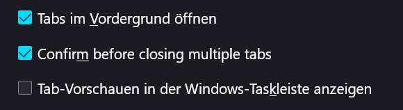 • Danke, aborix. Aber bei mir kommt keine Meldung, weder beim Schließen eines noch mehrerer Tabs. Übrigens auch nicht in Fx 92.