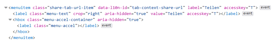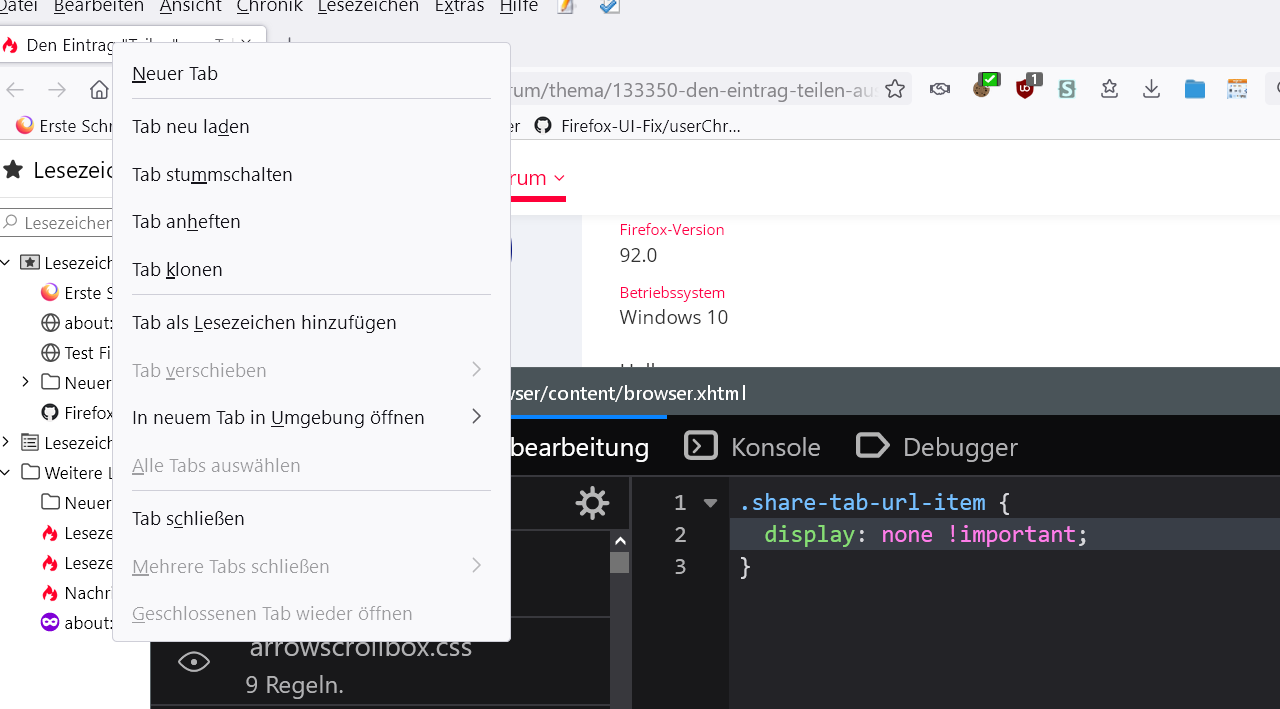 ich habe im Tab-Kontextmenü die meisten Einträge rausgeschmissen. Mit dem FF 92.0 ist nun zu den noch übrigen "Teilen" neu dazugekommen. Das hätte ich auch gerne weg, aber ich bekomme es nicht hin. Was mache ich falsch?