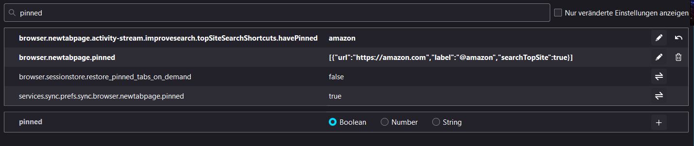 In 'about:config' finden sich bei einer Suche mit 'pinned' die Amazon-Suchmaschinen wieder. Löschen nützt nichts, der "amazon"-Eintrag bleibt angepinnt.