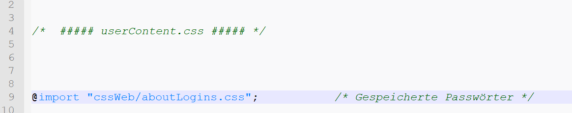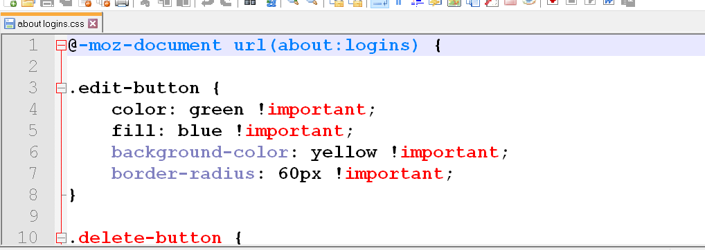 Alles anzeigen@-moz-document url(about:logins) { .edit-button { color: green !important; fill: blue !important; background-color: yellow !important; border-radius: 60px !important; } .delete-button { color: red !important; fill: blue !important; background-color: lightblue !important; border-radius: 60px !important; } .edit-button:hover, .delete-button:hover { background-color: orange !important; } }Die Farben kannst du dir beliebig anpassen, auch bei hover.