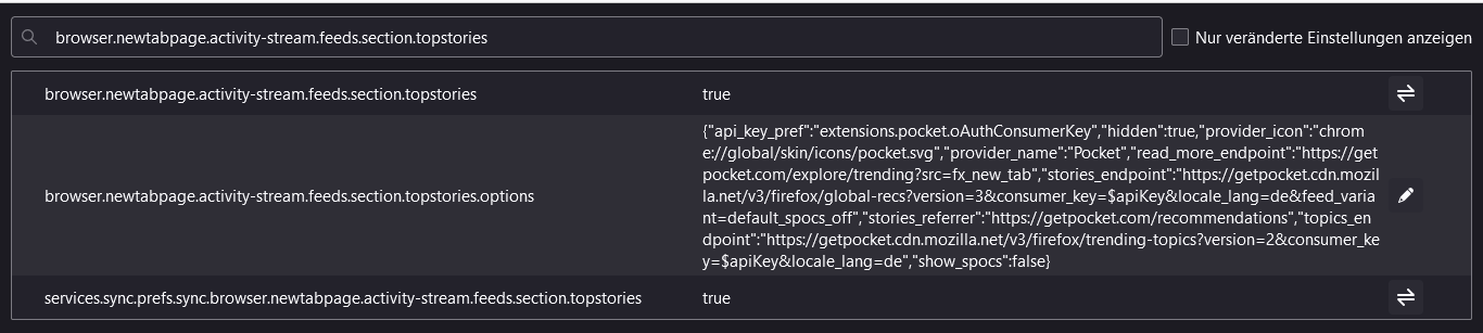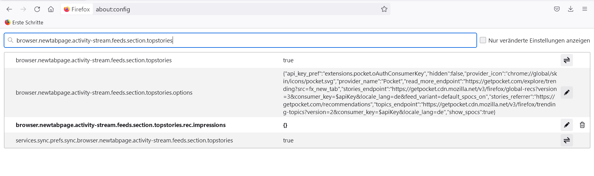 Um mir selbst zu helfen, habe ich zwei auf diesem Forum vorhandene Threads durchgelesen ("Unter Einstellungen für neue Tabs anpassen taucht Empfohlen von Pocket nicht auf" und "Empfohlen von Pocket nicht vorhanden"; tut mir leid, ich weiß nicht, wie man Threads direkt verlinkt). Ich habe, glaube ich, alle dort vorgeschlagenen Tricks ausprobiert, aber leider ohne Erfolg. Unter about:config und dann browser.newtabpage.activity-stream.feeds.section.topstories stand der Wert bereits auf true.
