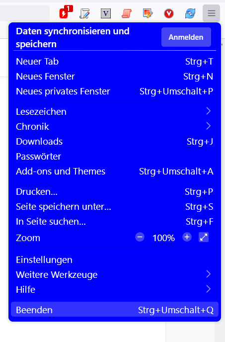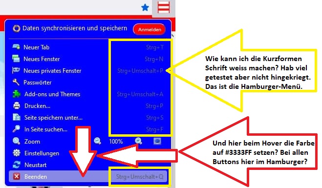 CSS/* HamburgerMenü Hintergrund Farbe ändern */ panel#appMenu-popup panelview { background-color: blue !important; color: white !important; }Ich teste noch weiter aber für Hilfe bedanke ich mich schon jetzt.