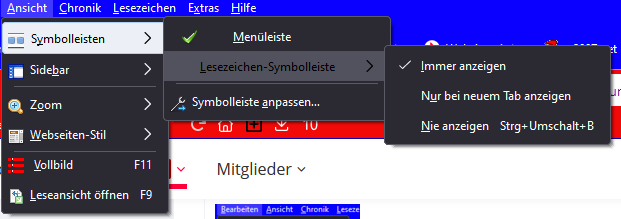 Menü-Ansicht Symbolleisten: Da konnte ich bis jetzt beim Lesezeichen-Symbolleiste kein Icon einfügen. Keine Ahnung warum es nicht geht oder ob ich es garnicht gefunden habe zum bearbeiten, weiss ich nicht mehr. :)