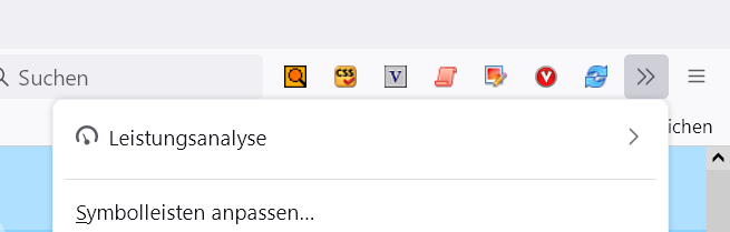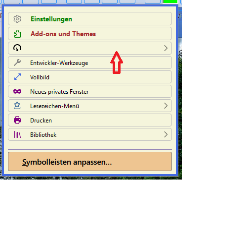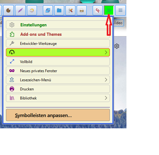 Wenn ich Symbolleiste anpassen aufrufe, dann von links nach rechts in das Menü verschiebe, so erscheint nach Beendigung der Button mit den zwei Pfeilen. Damit rufe ich dann das Menü auf.