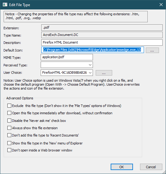 Ich benutze das gleiche Edge-PDF-Icon wie du. Allerdings wirklich nur das Icon, als Standardbetrachter für PDF-Dateien ist der Firefox eingetragen. Man kann ja relativ einfach z.B. mit dem FileTypesManager v1.95 das Standard-Icon ändern. Zuerst Firefox als Standardbetrachter für '.pdf' unter den Windows Einstellungen auswählen und dann im FileTypesManager in der Liste '.pdf'-suchen und mit Doppelklick öffnen. Für das Edge-PDF-Icon folgende Zeile unter 'Default Icon:' eintragen