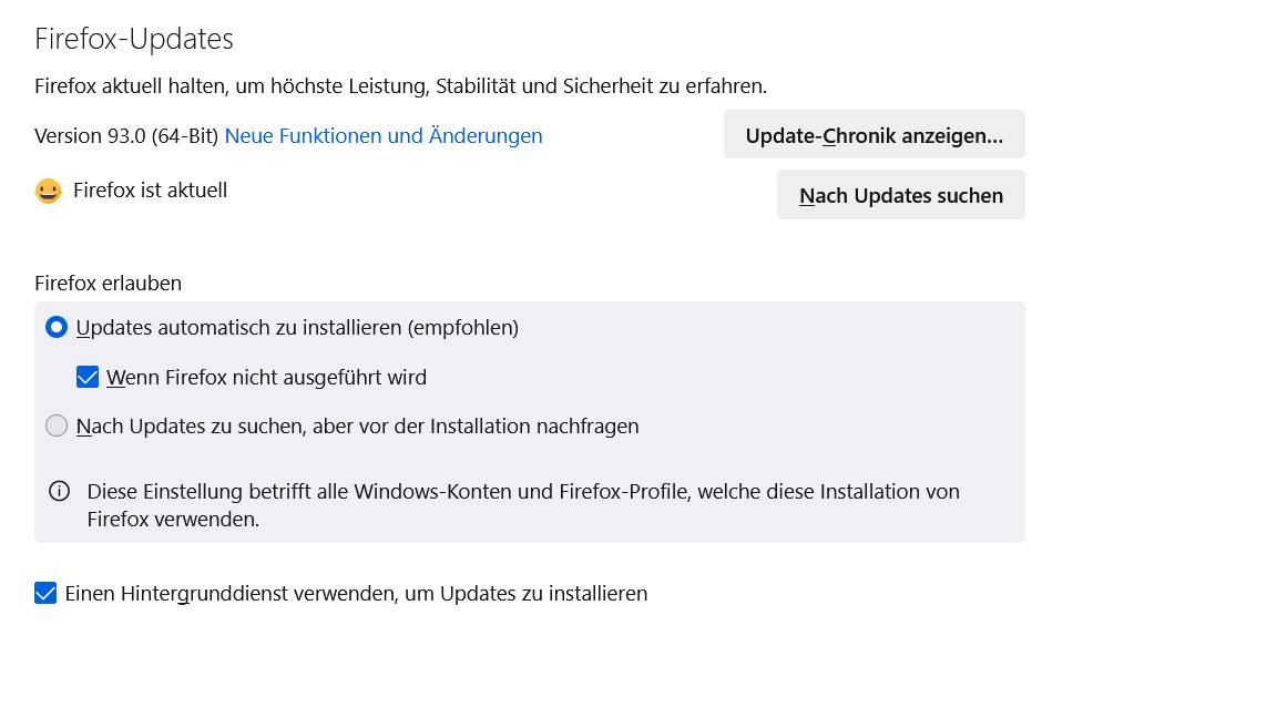 27. Oktober 2021 um 10:22 #22 Zitat von Tamina Ach das heißt die Updates werden dann künftig sowohl installiert wenn der Firefox Browser in Benutzung ist und aber auch wenn er nicht in Benutzung ist. Und vorher gings nur wenn der Browser geöffnet war. Sehe ich das richtig? Danke dir Korrekt.