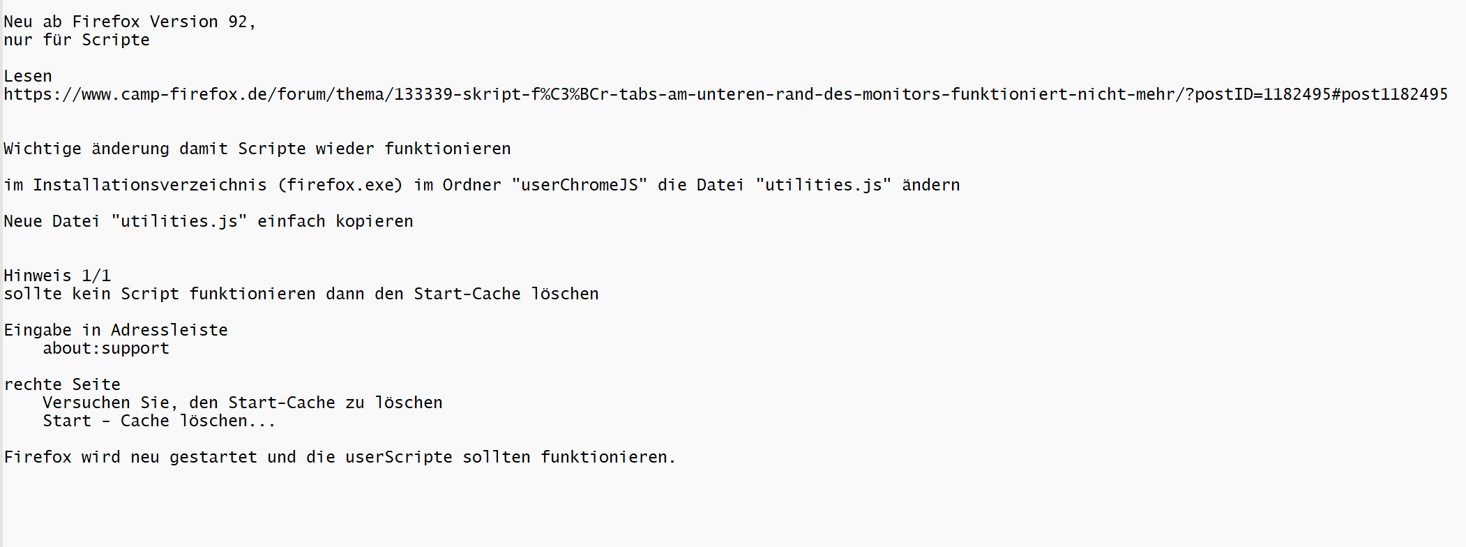 Wenn du jetzt kein Skript hast: Gib about:support in die Adressleiste ein und klicke dort rechts oben auf die Schaltfläche Start-Cache löschen. Firefox wird jetzt neu gestartet und der Skript-Cache wird geleert.