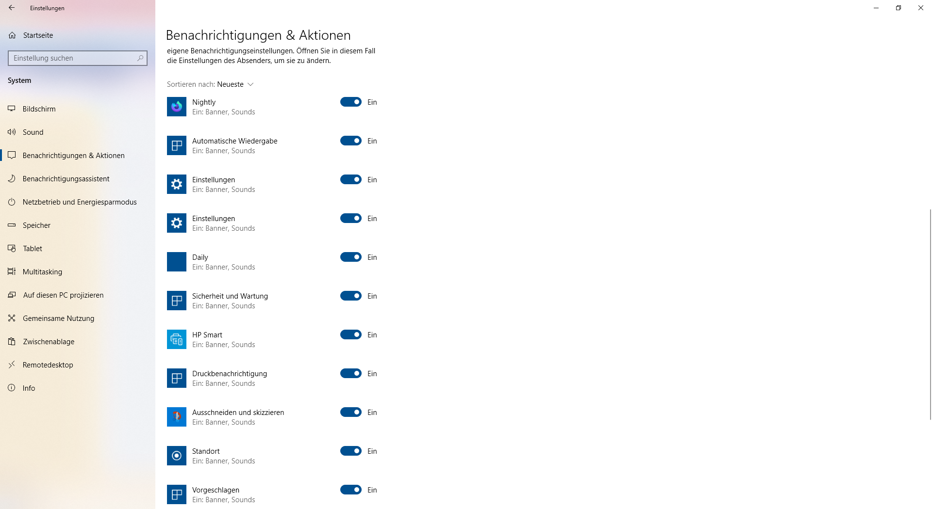 Hatte ich erst, jetzt stand es auf nur mit Priorität. Ich hatte allerdings vorhin im Info-Fenster mal drauf geklickt und bin dann in die PC-Einstellungen. Dort war „Benachrichtigungen von Apps und anderen Absendern abrufen“ auf Aus gestellt. Die Liste war dadurch ausgegraut. Ich habe auf Ein gestellt, die Liste wurde aktiv und sieht so aus: