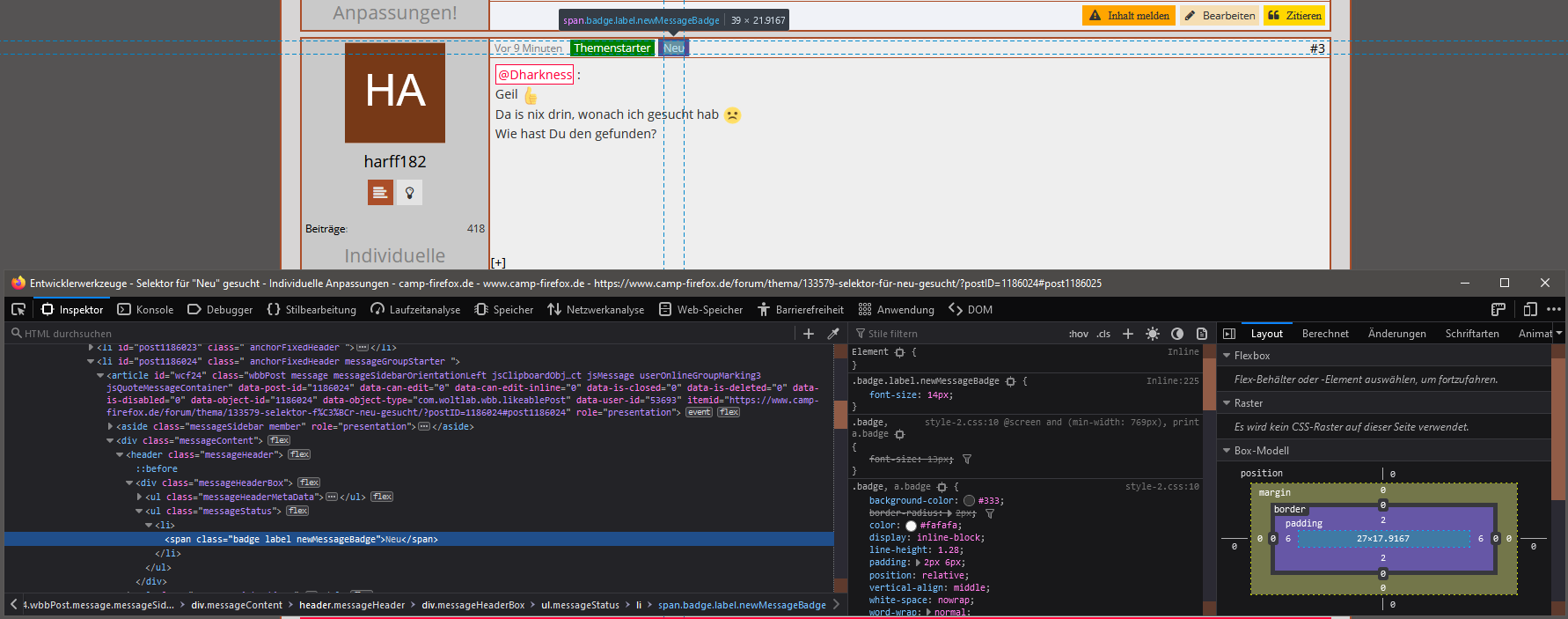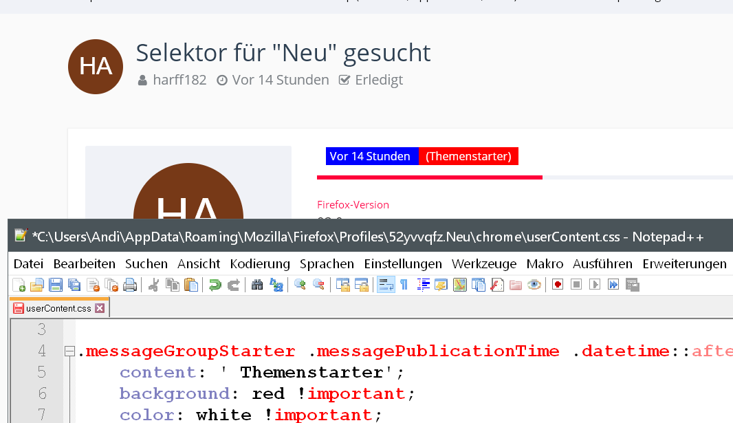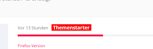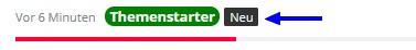 Alles anzeigen.messageGroupStarter .messagePublicationTime .datetime::after { content: ' Themenstarter'; background-color: red; color:white; padding-block: 5px; padding-left: 5px; padding-right: 8px; } *, ::before, ::after { box-sizing: inherit; min-width: 0; } .messageHeaderMetaData .messagePublicationTime { color: blue; } .badge.label.newMessageBadge { .badge, a.badge { font-size: 13px; } .badge, a.badge { background-color: blue; border-radius: 2px; color: white; display: inline-block; line-height: 1.28; padding: 2px 6px; position: relative; vertical-align: middle; white-space: nowrap; word-wrap: normal; font-weight: 400; } }und so siehts aus.. ohne das "Neu".